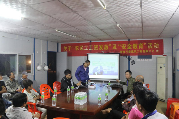 長期以來,海南萬泰都把農(nóng)民工利益擺在重要位置。不斷通過豐富的形式積極開展相關(guān)培訓教育活動。現(xiàn)今,鑒于年關(guān)將至,工資能否正常發(fā)放關(guān)系到農(nóng)民工的切身利益,為了進一步規(guī)范各項目農(nóng)民工工資發(fā)放手續(xù),維護農(nóng)民工合法權(quán)益,確保農(nóng)民工工資能夠正常發(fā)放,同時,為強化年底工地安全管理,進一步增強農(nóng)民工安全意識,海南萬泰計劃在年前對各項目實地開展相關(guān)培訓活動,切實做好年底相關(guān)準備工作。