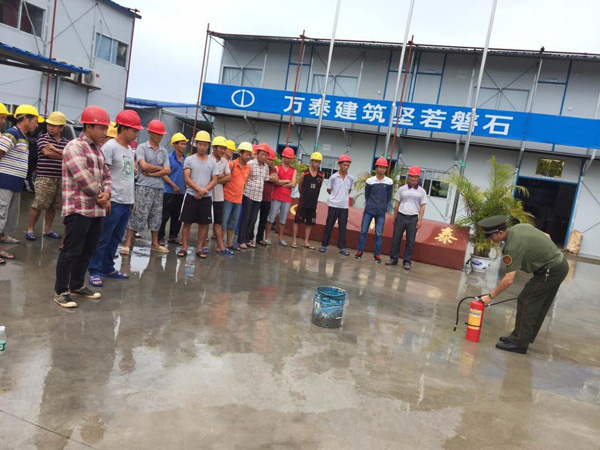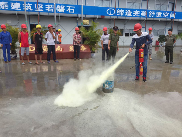為提高全員消防意識,增強工人在緊急情況下的應變能力和自我防護能力,加強工地消防安全管理,強化工地自查自糾工作機制,有效消除火災隱患,營造一個安全文明的施工環(huán)境。8月29日上午,海南萬泰建筑工程有限公司邀請了瓊中縣消防大隊,在瓊中加釵農(nóng)場加鑫商業(yè)廣場項目部開展了意義重大的消防演練活動,帶領(lǐng)項目工人學習消防知識技能。