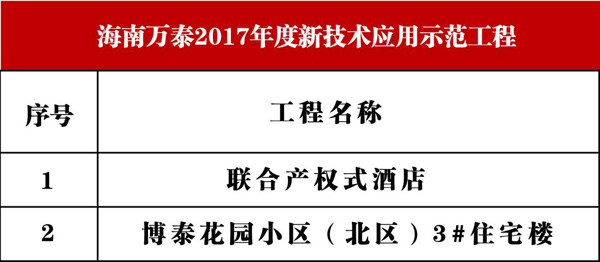 近日,海南省住房和城鄉(xiāng)建設廳發(fā)布公告,公布了2017年度海南省建筑業(yè)新技術應用示范工程立項評審結果,共計24項工程獲評新技術示范工程。其中,海南萬泰建筑住工程有限公司承建的“聯(lián)合產(chǎn)權式酒店“和”博泰花園小區(qū)(北區(qū))3#住宅樓“兩個項目名列榜單。