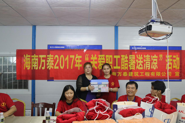 本次送清涼活動,海南萬泰公司共送出14箱菊花茶,400件T恤以及部分應(yīng)急醫(yī)藥品。項目部林總代表項目工人對公司的關(guān)懷及慰問表示由衷的感謝。