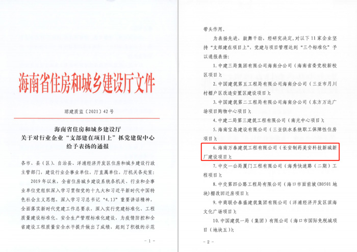 陽(yáng)春三月春意濃,牛年大吉開(kāi)門(mén)紅!喜慶春節(jié)剛過(guò),迎來(lái)十四五開(kāi)局,恰逢全國(guó)“兩會(huì)”勝利召開(kāi)之際,海南萬(wàn)泰建筑工程有限公司長(zhǎng)安制藥美安科技新城新廠建設(shè)項(xiàng)目榮獲海南省住房和城鄉(xiāng)建設(shè)廳對(duì)“支部建在項(xiàng)目上”抓黨建促中心工作通報(bào)表?yè)P(yáng),全省共11家企業(yè)獲得此殊榮,海南萬(wàn)泰為獲表彰的民企之一。