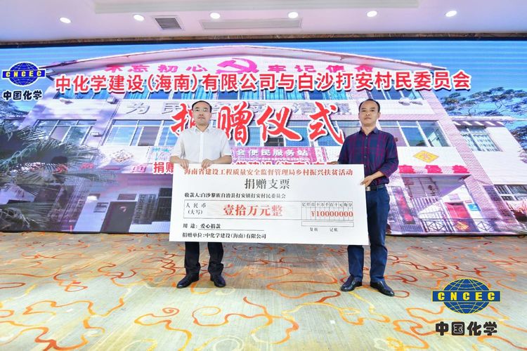 在捐贈儀式環(huán)節(jié),中化學建設(海南)有限公司董事長姚輝國、總經理張小龍和海南萬泰建筑工程有限公司常務副總經理顏利共同為白沙縣打安村捐贈20萬元,體現(xiàn)了企業(yè)在發(fā)展的同時,不忘承擔社會責任,慷慨解囊,助力鄉(xiāng)村基礎設施建設,改善民生問題,推動鄉(xiāng)村振興工作進一步發(fā)展。