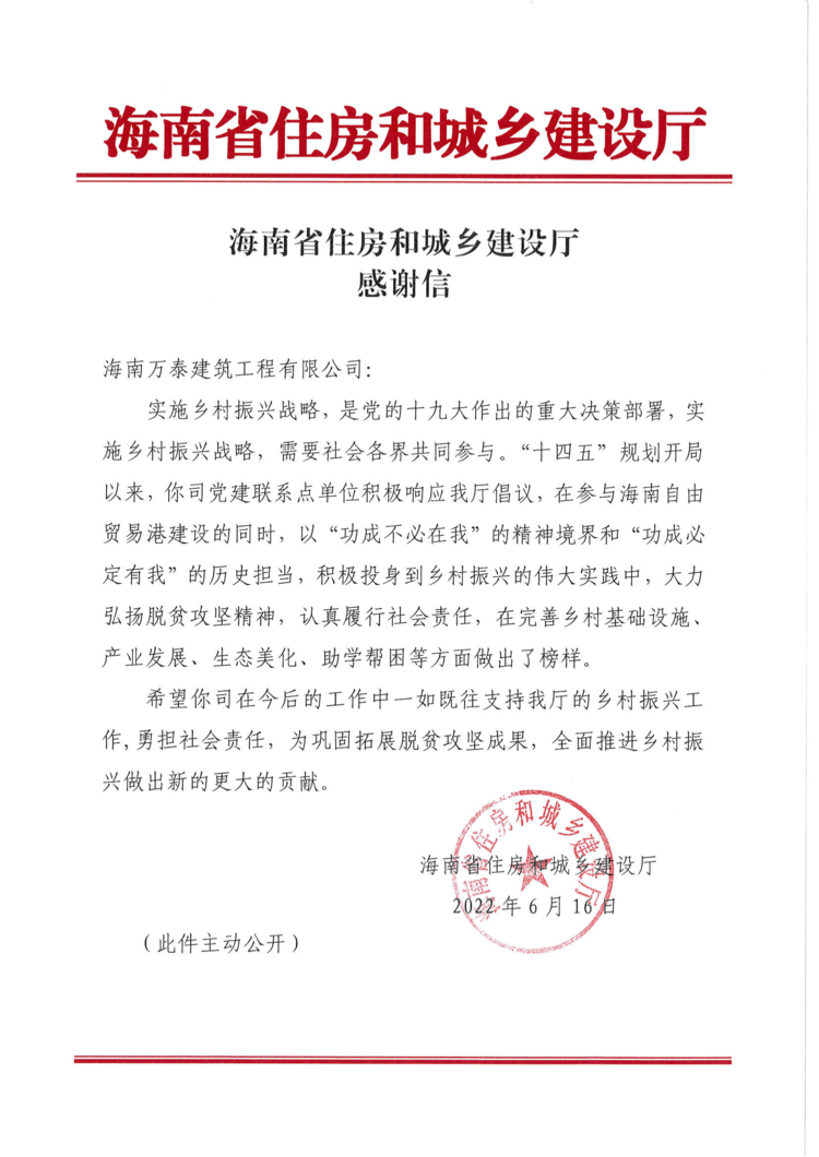 盛夏六月,喜事連連。在海南萬(wàn)泰建筑工程有限公司成立十一周年之際,公司喜獲海南省住房和城鄉(xiāng)建設(shè)廳的感謝信,信中表彰了萬(wàn)泰公司響應(yīng)省住建廳倡議,積極投身到鄉(xiāng)村振興事業(yè),大力弘揚(yáng)脫貧攻堅(jiān)精神,認(rèn)真履行社會(huì)責(zé)任,在完善鄉(xiāng)村基礎(chǔ)設(shè)施、產(chǎn)業(yè)發(fā)展、生態(tài)美化、助學(xué)幫困等方面做出了榜樣。