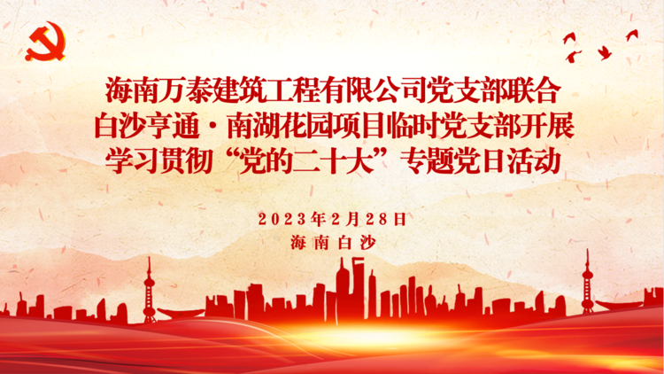 春暖花開,萬物可期。為學(xué)習(xí)貫徹落實黨的二十大會議精神,將黨建工作與業(yè)務(wù)工作有機結(jié)合,發(fā)揮基層黨組織戰(zhàn)斗堡壘的作用,在海南省質(zhì)安局的關(guān)心指導(dǎo)下,2023年2月28日,海南萬泰公司黨支部、工程部有關(guān)負責(zé)同志到項目部現(xiàn)場為白沙亨通·南湖花園項目黨建聯(lián)建共創(chuàng)基地舉行揭牌儀式,并聯(lián)合項目臨時黨支部開展了學(xué)習(xí)貫徹“黨的二十大”專題黨日活動,同時,對項目工地的塔吊等重型機械進行了安全檢查。