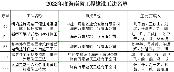 近日,由海南萬(wàn)泰建筑工程有限公司申報(bào)的《大型主體公園復(fù)雜埋地管道精準(zhǔn)施工技術(shù)》《復(fù)雜外立面高層建筑附著式電動(dòng)提升作業(yè)平臺(tái)施工工法》《高層住宅全現(xiàn)澆混凝土填充外墻施工工法》《精確控制泥漿下灌注樁混凝土施工頂標(biāo)高施工工法》《新型可調(diào)節(jié)式盤(pán)扣橫桿施工工法》共5項(xiàng)省級(jí)工法通過(guò)省住建廳評(píng)審,并頒發(fā)了相應(yīng)省級(jí)工法證書(shū)。據(jù)悉,這5項(xiàng)省級(jí)工法是公司的個(gè)別工程項(xiàng)目經(jīng)過(guò)實(shí)踐總結(jié)出來(lái)的技術(shù)成果,具有良好的安全性、經(jīng)濟(jì)性和適用性,可提高工效、縮短工期、大幅降低工程成本。此次通過(guò)的省級(jí)工法,是萬(wàn)泰在工程施工技術(shù)方面的重大創(chuàng)新,后續(xù)我司將廣泛推廣至各工程項(xiàng)目中加以應(yīng)用。