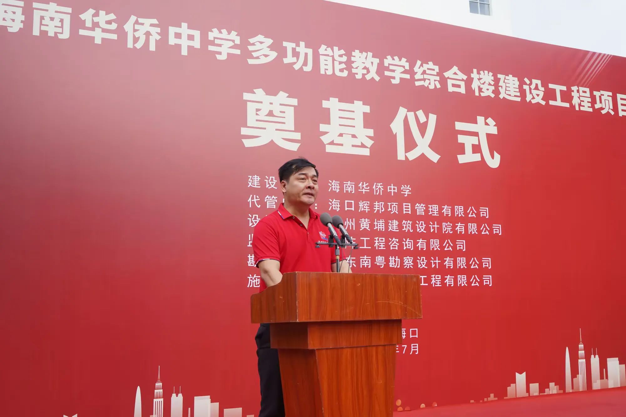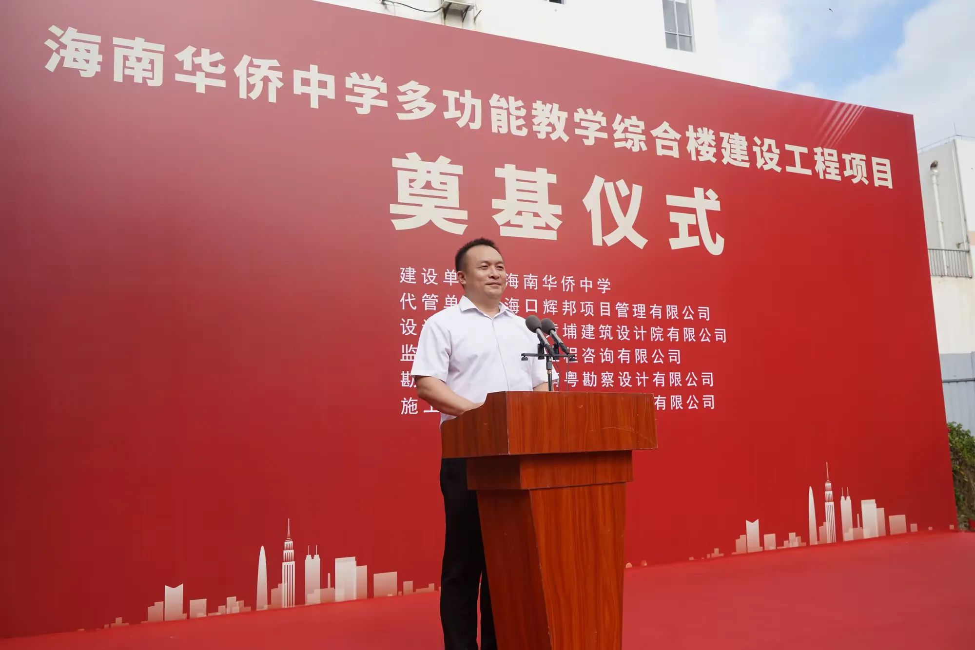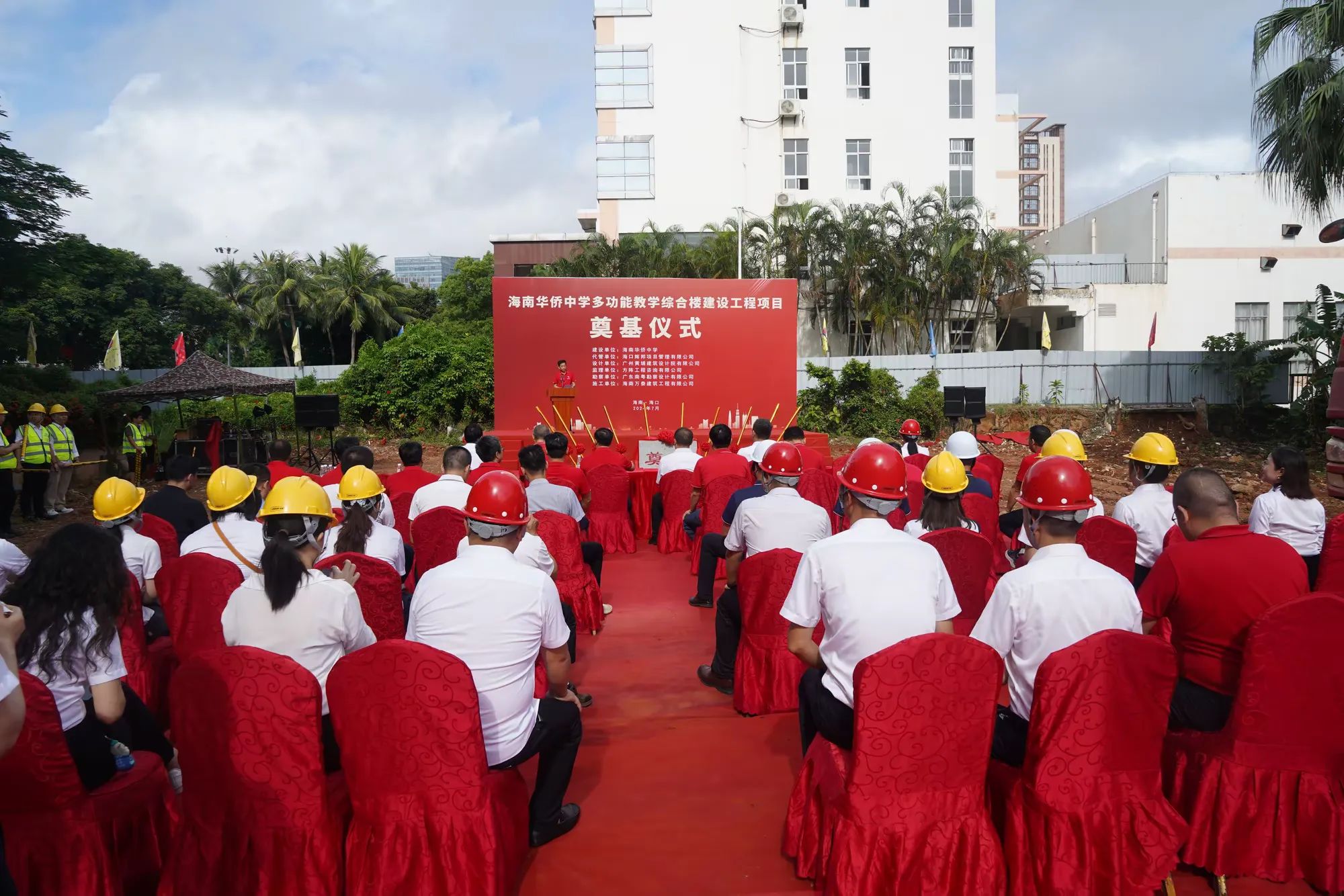 七月綠意爭相艷,書生意氣冠瓊州。7月19日,由海南萬泰建筑工程有限公司承建的海南華僑中學(xué)多功能教學(xué)綜合樓建設(shè)工程項目舉行開工儀式。??谑邪l(fā)改委黨組成員、副主任莊華東,海南華僑中學(xué)黨委副書記、校長張偉,黨委委員、副校長吳撼宇,??谑谐峭都瘓F黨委副書記、董事、總經(jīng)理孫傳志以及代管、監(jiān)理、施工單位相關(guān)人員參加了本次活動。儀式由海南華僑中學(xué)副校長吳澤純主持。