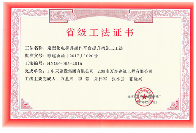2017年12月5日,海南省住房和城鄉(xiāng)建設(shè)廳發(fā)布公告,公布了2016年度海南省省級工法名單。海南萬泰建筑工程有限公司申報的兩項工法(定型化電梯井操作平臺提升架施工工法、加強斜屋面施工質(zhì)量的組合施工工法)名列榜單,且得票數(shù)均為13票,得票率百分之百。