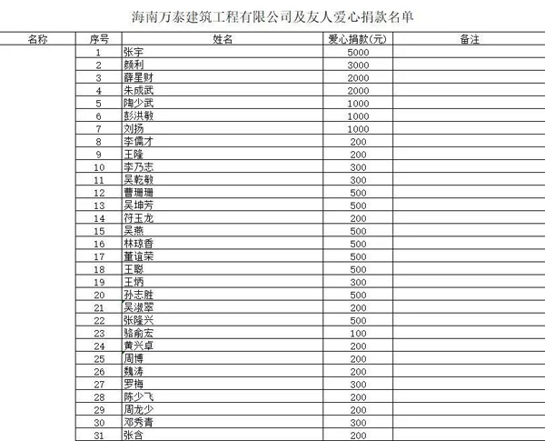 1月28日,我們?cè)诤D先f(wàn)泰建筑公眾號(hào)發(fā)布了海南萬(wàn)泰公司張小龍總經(jīng)理和??谑欣夏耆烁@喉?xiàng)目負(fù)責(zé)人林莉共同出資5萬(wàn)元購(gòu)買(mǎi)5000個(gè)N95口罩及飛利浦G31E病人監(jiān)護(hù)儀1套捐贈(zèng)給武穴市及張小龍總經(jīng)理組織同胞募捐的文章《心系荊楚,共渡難關(guān),這場(chǎng)戰(zhàn)“疫”,海南萬(wàn)泰在行動(dòng)!》,在公司引起了極大反響,大家主動(dòng)問(wèn)詢?nèi)绾尉杩顬楹币咔楸M一份力,大家的一腔熱血和愛(ài)心令人動(dòng)容,由此,我們迅速成立萬(wàn)泰籌募組,在公司內(nèi)部展開(kāi)了愛(ài)心捐款。愛(ài)心捐款行動(dòng)一呼百應(yīng),在短短不到兩天的時(shí)間里,萬(wàn)泰募捐組就收到了來(lái)自公司員工,萬(wàn)泰各地項(xiàng)目部及公司的合作友人的支持。截止目前,萬(wàn)泰籌募組已籌得284380元的善款!這些善款,我們已全部捐贈(zèng)給武穴市梅川鎮(zhèn)政府用于抗擊湖北疫情。捐款情況已向海南省湖北商會(huì),武穴市工商聯(lián),武穴市統(tǒng)戰(zhàn)部匯報(bào)。后續(xù)我們將跟蹤款項(xiàng)用途。