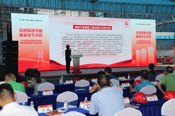 為了進(jìn)一步加強(qiáng)黨建聯(lián)系點(diǎn)的溝通交流,繼續(xù)深入推進(jìn)黨建聯(lián)創(chuàng)共建工作,鞏固抓黨建促工程質(zhì)量安全水平提升的成效。9月25日上午,2020年海南省建設(shè)工程黨建聯(lián)建共創(chuàng)暨質(zhì)量安全觀摩交流會(huì)在南光·西海灣項(xiàng)目部舉行。省住建廳機(jī)關(guān)黨委專職副書記劉志偉、省質(zhì)安局陳雷書記、省質(zhì)安局副局長(zhǎng)劉長(zhǎng)征、市質(zhì)安站站長(zhǎng)符志明及各黨建聯(lián)創(chuàng)共建企業(yè)黨支部、新聞媒體等單位參加了此次活動(dòng)。海南萬(wàn)泰公司黨支部作為省住建系統(tǒng)黨建聯(lián)系點(diǎn)參加了會(huì)議,并做了黨建工作經(jīng)驗(yàn)交流發(fā)言。