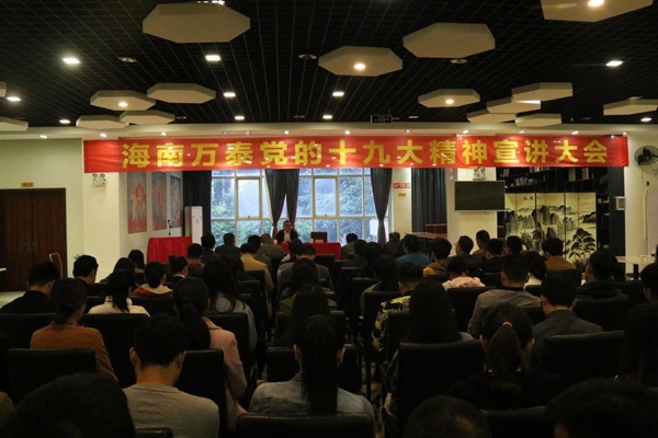 為深入貫徹十九大精神,落實(shí)十九大精神入基層、進(jìn)企業(yè)的要求,11月25日,湖北省政府駐海南辦事處主任、湖北省駐瓊黨工委書記黃烈焰;副主任、黨工委副書記馮?。缓D鲜『鄙虝?wù)副會長、五指山清能地產(chǎn)公司董事長羅曉東組成的宣講團(tuán)到海南萬泰建筑工程有限公司宣傳貫徹黨的十九大精神。