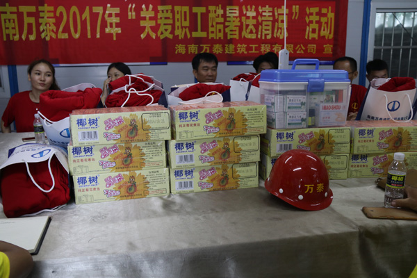 本次送清涼活動,海南萬泰公司共送出14箱菊花茶,400件T恤以及部分應(yīng)急醫(yī)藥品。項目部林總代表項目工人對公司的關(guān)懷及慰問表示由衷的感謝。