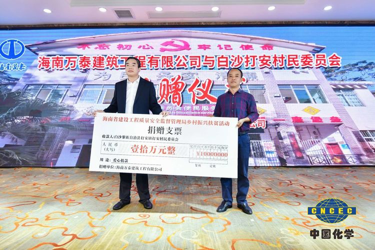 在捐贈儀式環(huán)節(jié),中化學建設(海南)有限公司董事長姚輝國、總經理張小龍和海南萬泰建筑工程有限公司常務副總經理顏利共同為白沙縣打安村捐贈20萬元,體現(xiàn)了企業(yè)在發(fā)展的同時,不忘承擔社會責任,慷慨解囊,助力鄉(xiāng)村基礎設施建設,改善民生問題,推動鄉(xiāng)村振興工作進一步發(fā)展。