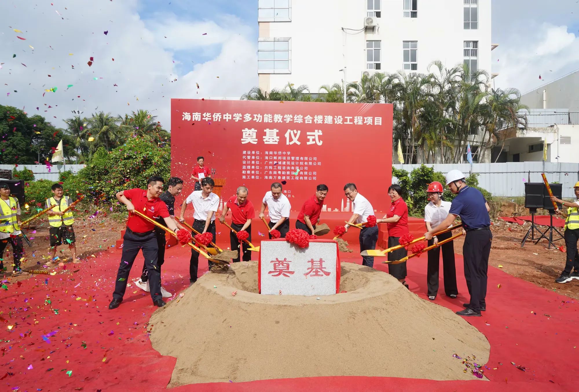 七月綠意爭相艷,書生意氣冠瓊州。7月19日,由海南萬泰建筑工程有限公司承建的海南華僑中學(xué)多功能教學(xué)綜合樓建設(shè)工程項目舉行開工儀式。??谑邪l(fā)改委黨組成員、副主任莊華東,海南華僑中學(xué)黨委副書記、校長張偉,黨委委員、副校長吳撼宇,??谑谐峭都瘓F黨委副書記、董事、總經(jīng)理孫傳志以及代管、監(jiān)理、施工單位相關(guān)人員參加了本次活動。儀式由海南華僑中學(xué)副校長吳澤純主持。