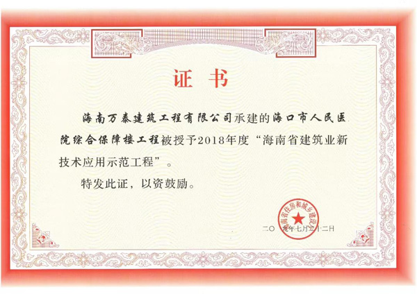 近期,海南省住房和城鄉(xiāng)建設(shè)廳下發(fā)了《關(guān)于公布2018年度海南省建筑業(yè)新技術(shù)應(yīng)用示范工程的通知》,由我司承建的??谑腥嗣襻t(yī)院綜合保障樓項目,獲評“2018年度海南省建筑業(yè)新技術(shù)應(yīng)用示范工程”。