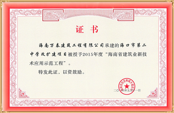 由海南萬(wàn)泰建筑工程有限公司承建的“??谑械诙袑W(xué)改擴(kuò)建項(xiàng)目”被海南省住房和城鄉(xiāng)建設(shè)廳授予2015年度“海南省建筑業(yè)新技術(shù)應(yīng)用示范工程”。