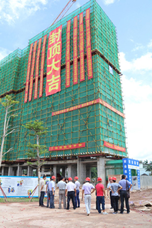 自今年二月份瓊?!靶胚_?銀海御湖(一期)”項目開工以來,海南萬泰施工團隊不畏艱辛,克服海南高溫多雨的氣候特點,保質(zhì)、保量,緊張施工,嚴格把控項目的各個施工細節(jié),“信達?銀海御湖(一期)”項目9#樓率先完成主體封頂。
