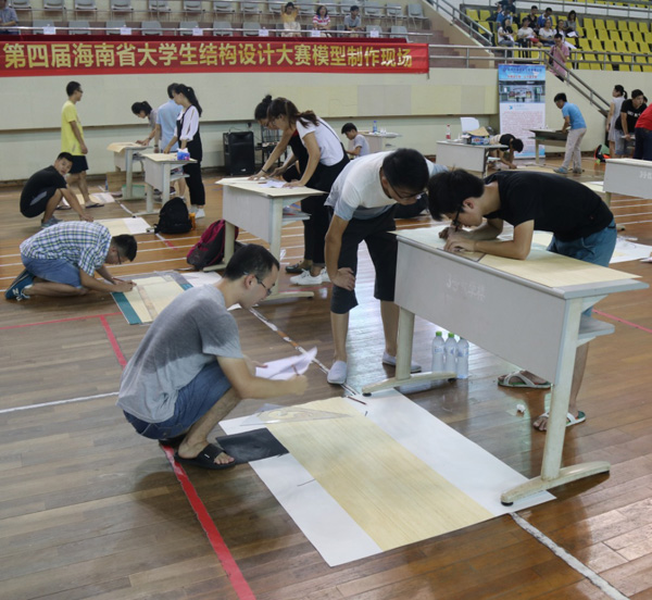 9點整,由海南大學校土木建筑系領導宣布比賽正式開始,同學們迫不及待的開始動手制作模型。薄如紙片的竹皮要裁切成相等長度和寬度的長條,用502膠水粘成竹棍,作為塔架的主梁和柱子。不僅要承受的住幾十斤鐵塊的重壓,還要承受的住相當于汶川地震級別的加載測試。選手們一個個信心滿滿,細心耐心加上專心。根據規(guī)則,比賽提供的膠水竹皮等材料如果不夠是不補發(fā)的,所以大家都小心翼翼,生怕出現意外。